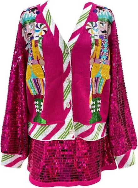 Queen Of Sparkles Hot Pink Peppermint Nutcracker Shard Sequin Sleeve Cardigan