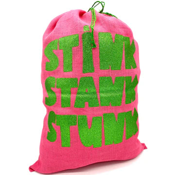 SANTA SACK WITH GLITTER PRINT IN PINK "STINK, STANK, STUNK"