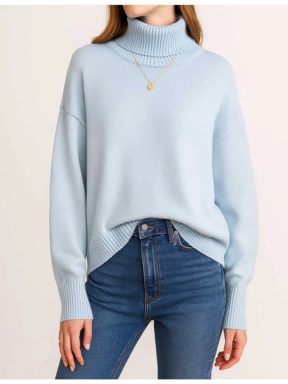 Ladies Solid Sky Blue Turtleneck Knit Sweater